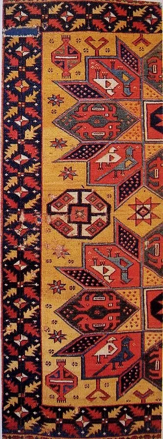 Carpet designs with a complex 16-pointed star motif made up of many different colored compartments with highly stylized animal motifs are classified as ‘Crivelli Carpets’.